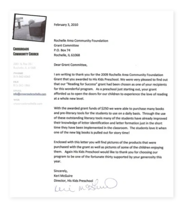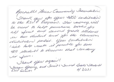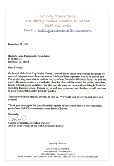 The Rochelle Area Community Foundation provides a simple way for members of the community to invest in the non-profit organizations that improve the lives of friends, neighbors and co-workers. Charitable gifts entrusted to the Foundation are invested in endowment funds, the principle gift is preserved, and a portion of the earnings provide annual grants to local not for profit organizations.